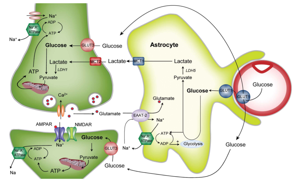 ・神経細胞:アストロサイトから供給される乳酸・GLUT3からのGlucoseを利用しクエン酸回路によりATPを産生する
