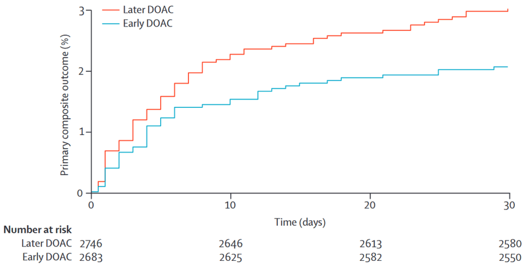 結論:心房細動による心原性脳塞栓症に対しての早期(発症4日以内)DOAC投与は遅らせた投与(発症7-14日)と比較して90日後の複合エンドポイント(上記)に関して非劣性である