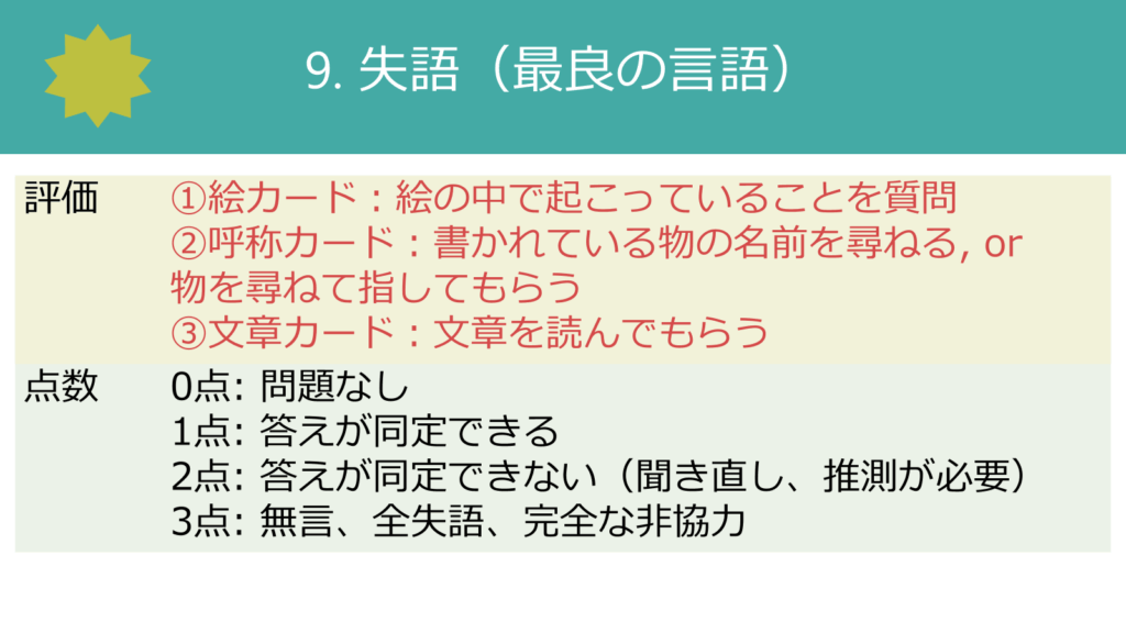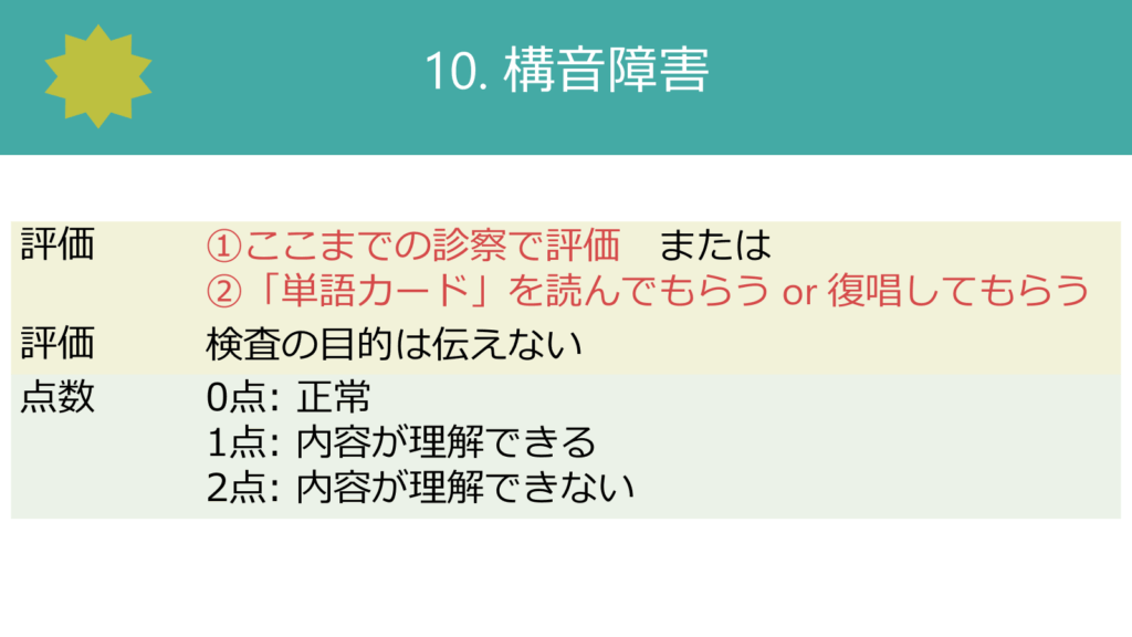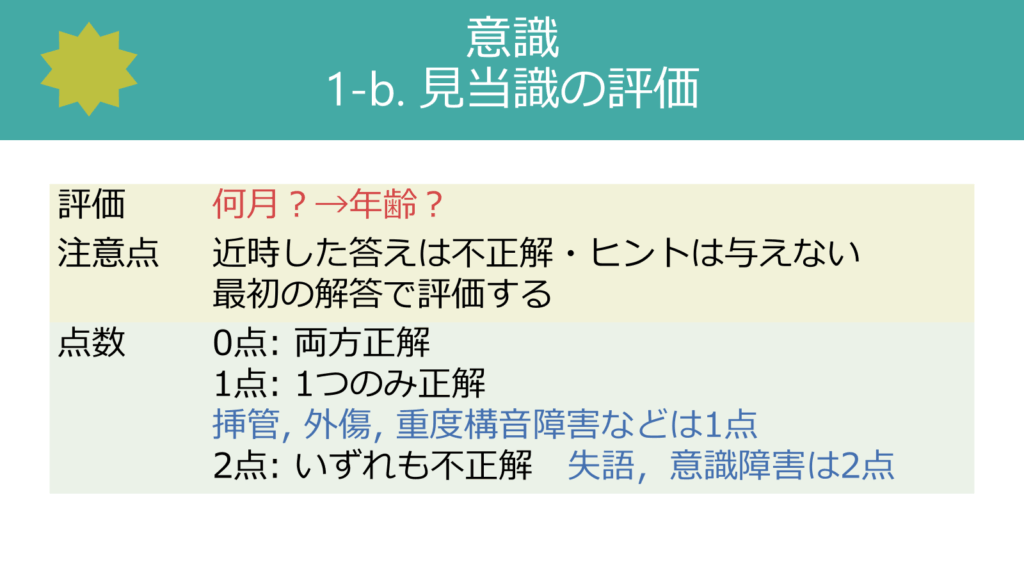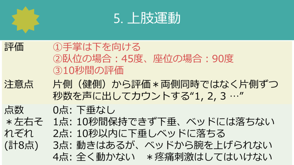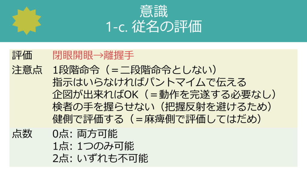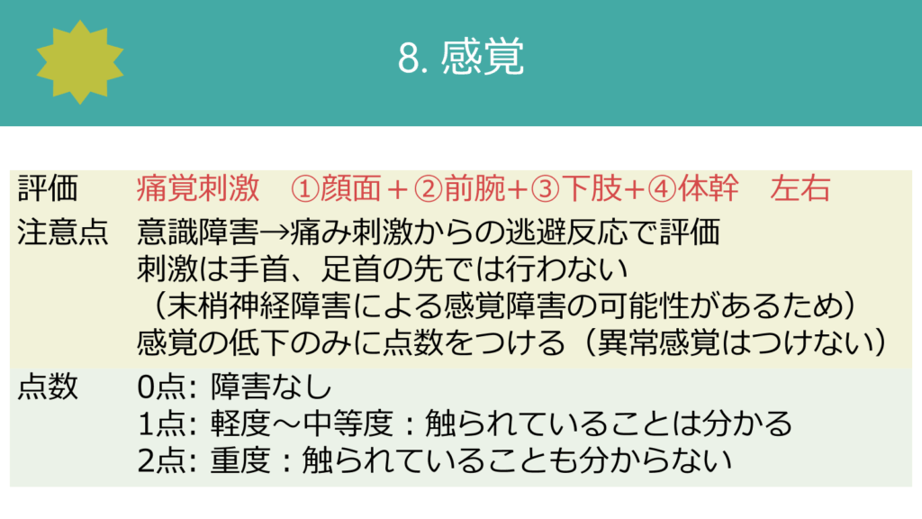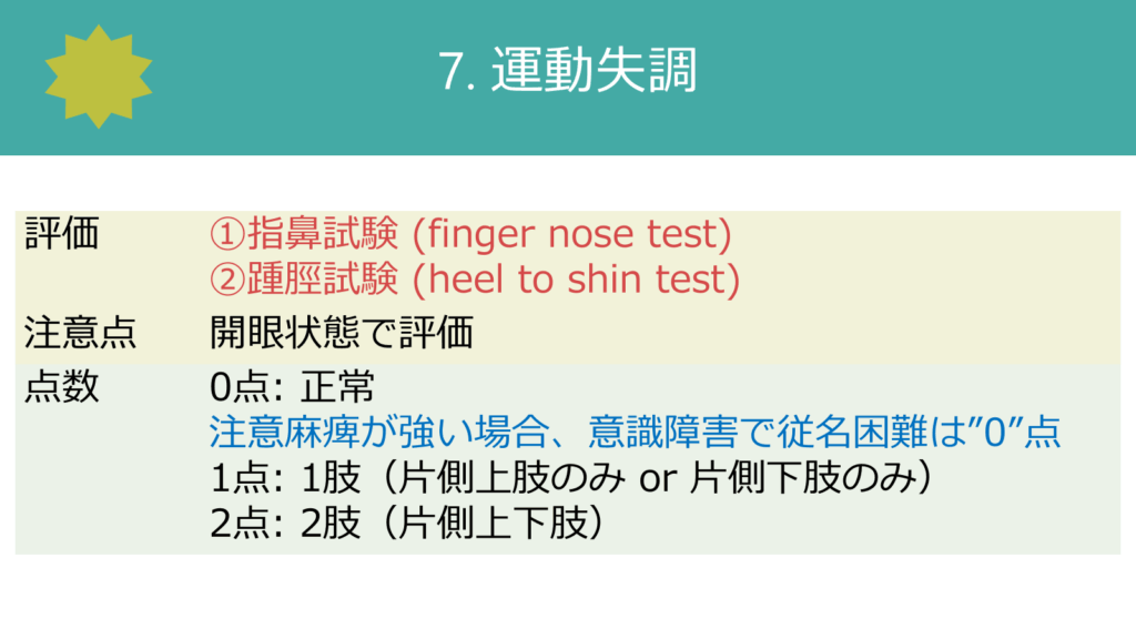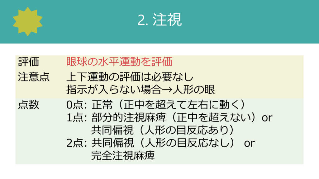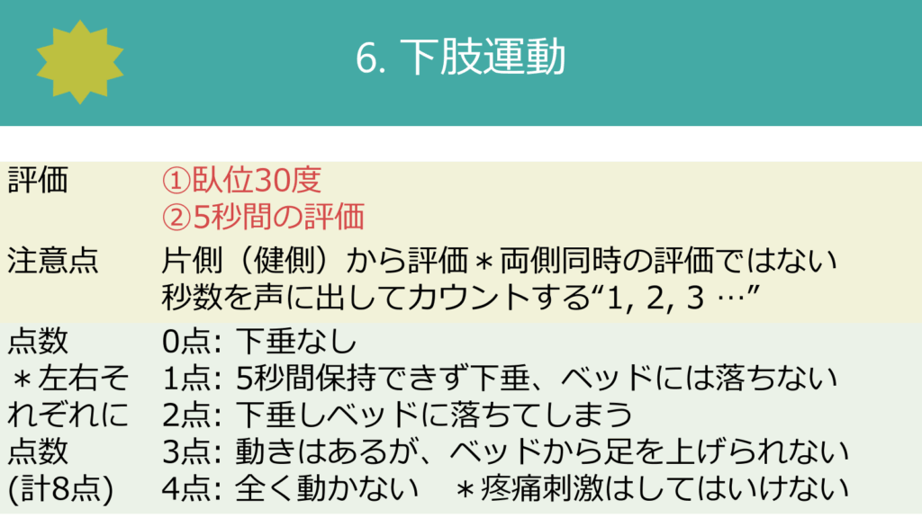 *麻痺、意識障害で従命困難な場合は”0”(推定無罪)になる点が特殊であり注意(このため昏睡患者でも最大点は42点ではなく40点になる)