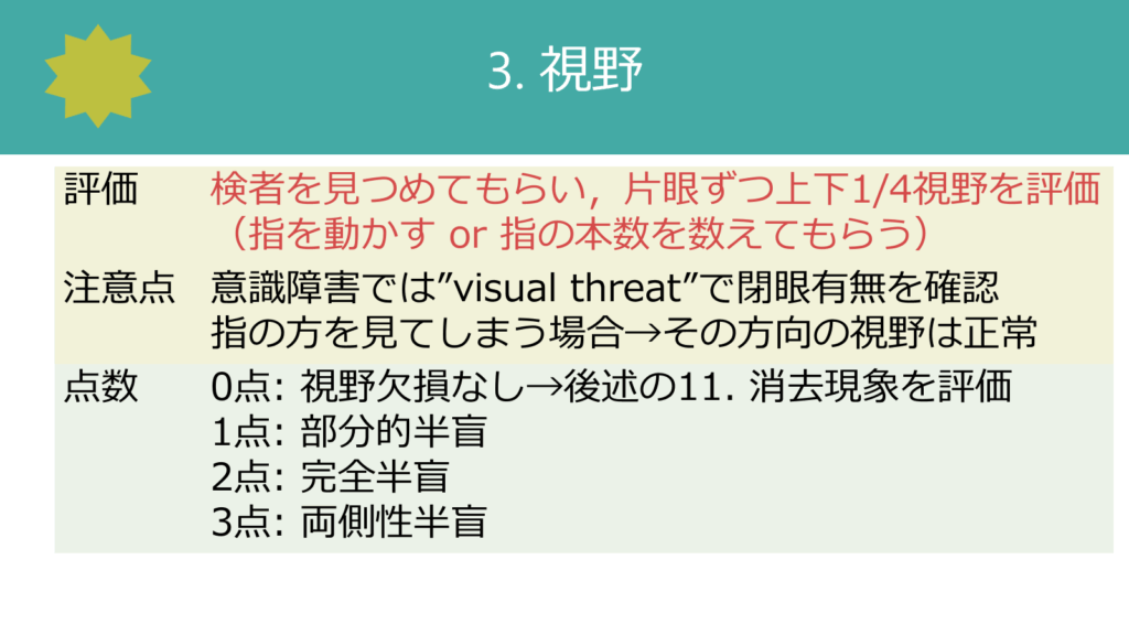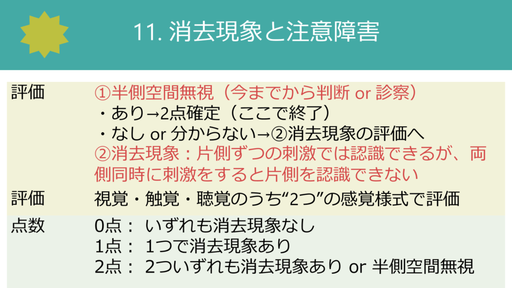 *消去現象は視覚・触覚で評価することが多い。片側ずつ刺激を出して、そのあと両側を刺激してきちんと「両方」と回答できるかを確認する。消去現象があると、両方刺激しても「右」や「左」と回答する。