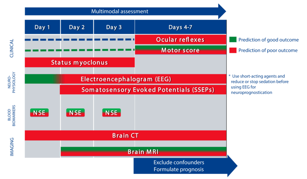 | SSEP (体性感覚誘発電位) のタイミング | タイミングに関する具体的なガイダンスはなし。 | 両側N20 SSEP波の欠如は、ROSC後24時間で不良な転帰の予測指標として示唆される。 | SSEPの実施と評価の推奨タイミングを早期(24時間)に設定。 |