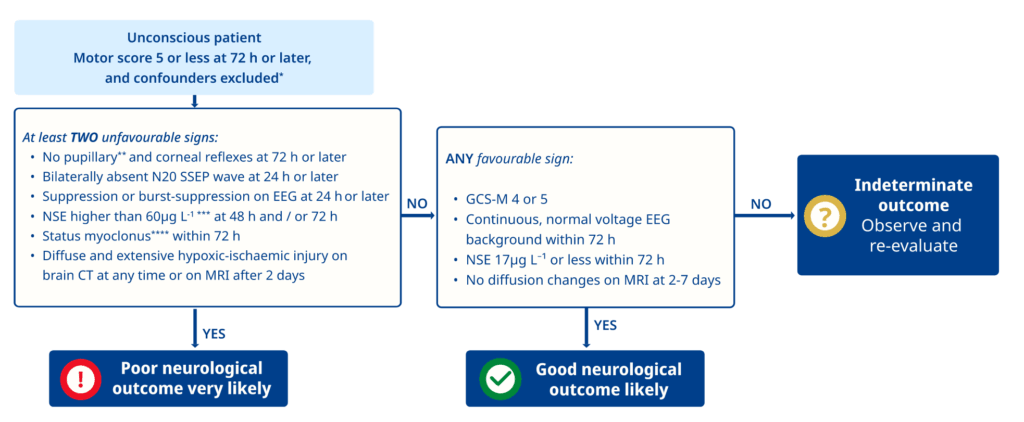 | 評価対象患者の基準 | ROSC後72時間時点で、異常な屈曲 (M3) よりも運動反応が良くない昏睡患者 (GCS運動スコア ≤3)。 | ROSC後72時間時点で、指示に従わない(覚醒していない)昏睡患者 (GCS運動スコア < 6)。 | 評価対象の範囲が拡大され、より多くの患者をアルゴリズムに含めることで、回復の可能性を見逃すリスクを減らす。 |