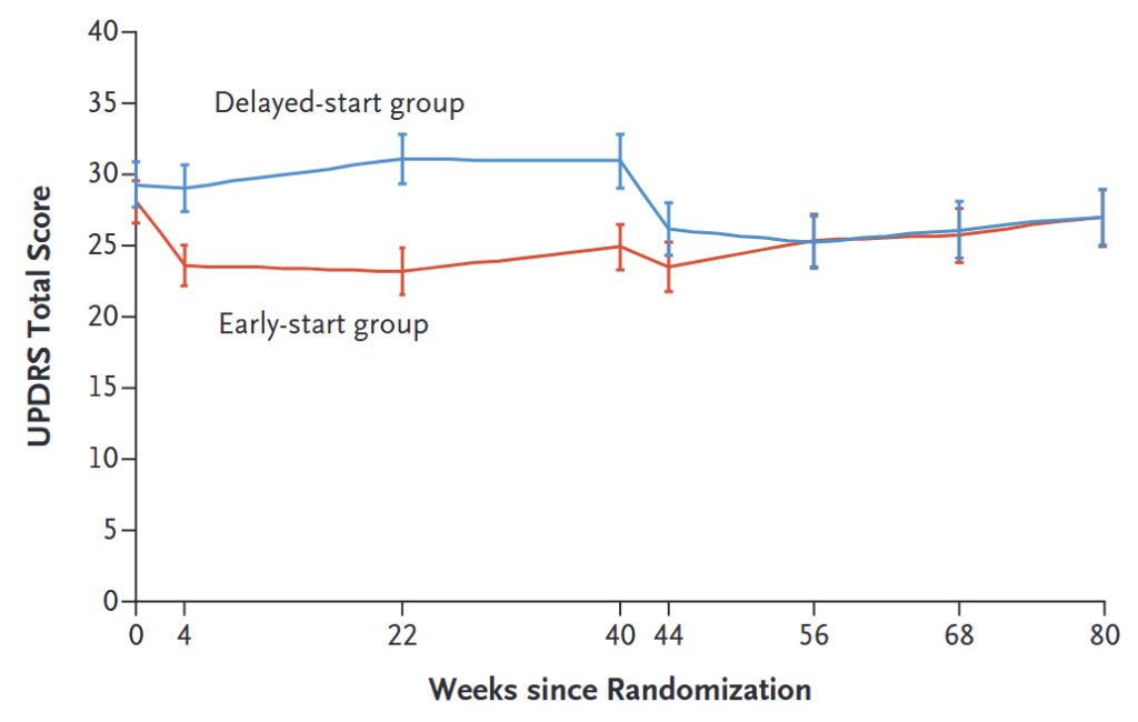 ⇒レボドパ早期に開始しても遅らせても運動機能は不変