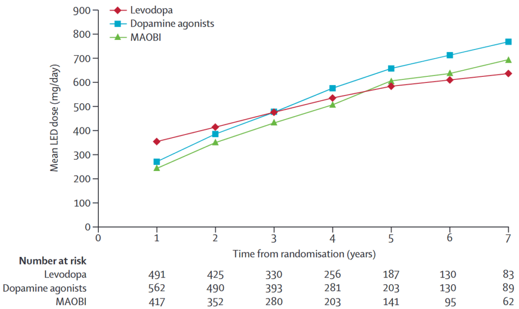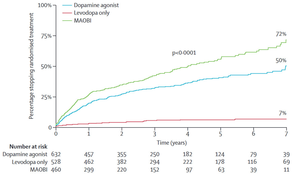 目的:パーキンソン病の初期治療として、レボドパ、ドパミンアゴニスト、モノアミン酸化酵素B阻害薬(MAOBI)のうち、どれが最も効果的な長期的な症状コントロールとQOL改善に寄与するのかを検討(特にレボドパとレボドパ温存のStrategyの違い)