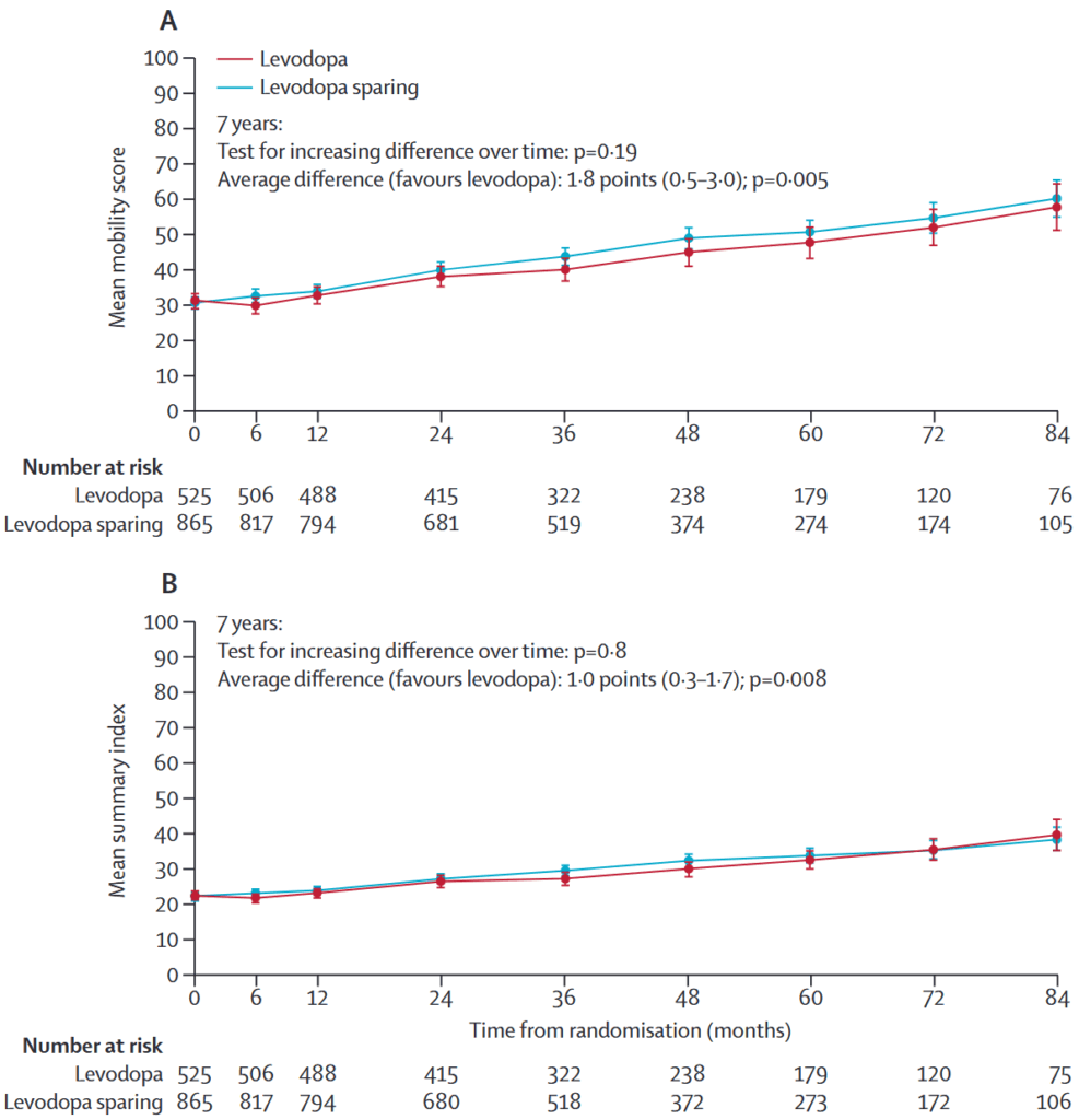 レボドパはレボドパ温存療法(DAまたはMAOBI)と比較して、患者が評価するQOLに小さくとも持続的な利益をもたらし、長期的なアウトカムを悪化させる懸念はない