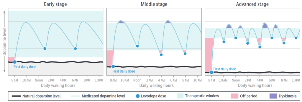 ・初期はtherapeutic windowが広い(honeymoon period)が,進行してくるとtherapeutic windowが狭くなり至適な薬物血中濃度を保つことが難しくなる(投与量が多すぎるとdyskinesiaを生じ,少ないとoffになる)