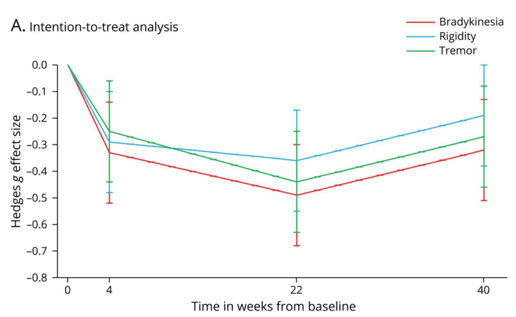 ・Long duration response:レボドパの効果は22週間>4週間の結果であり合致する
