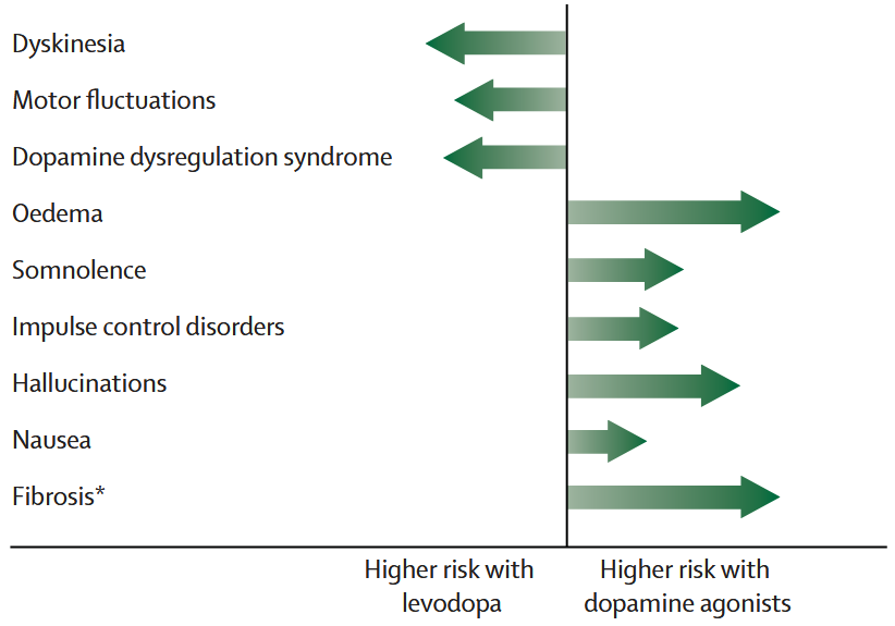 *Yahr3以上でドパミンアゴニスト単独での管理は厳しい(ドパミンアゴニストを増量してレボドパと同等の効果が得られるのはYahr2まで)