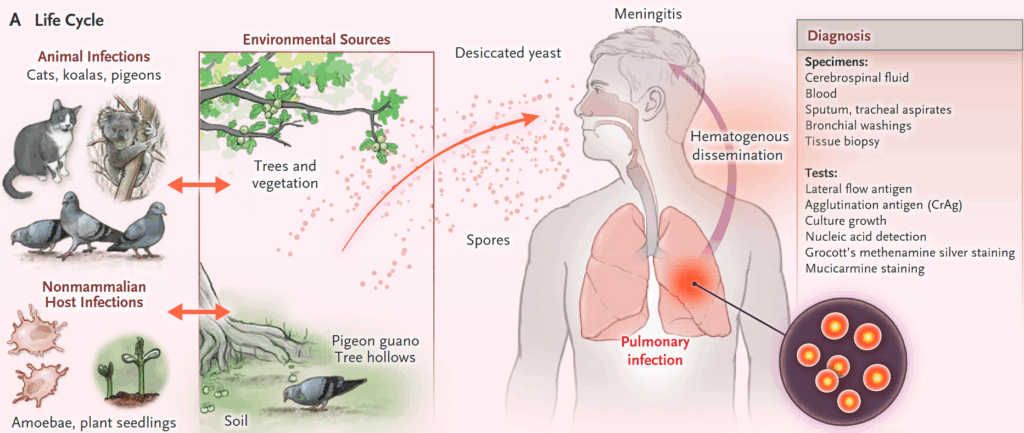 ・菌体は莢膜に包まれており、マクロファージに取り込まれて免疫細胞からの攻撃を免れる作戦をとる。具体的にはマクロファージに取り込まれたまま脳血管上皮細胞を通過し、血液脳関門を超える。髄液は発育しやすい環境である。
