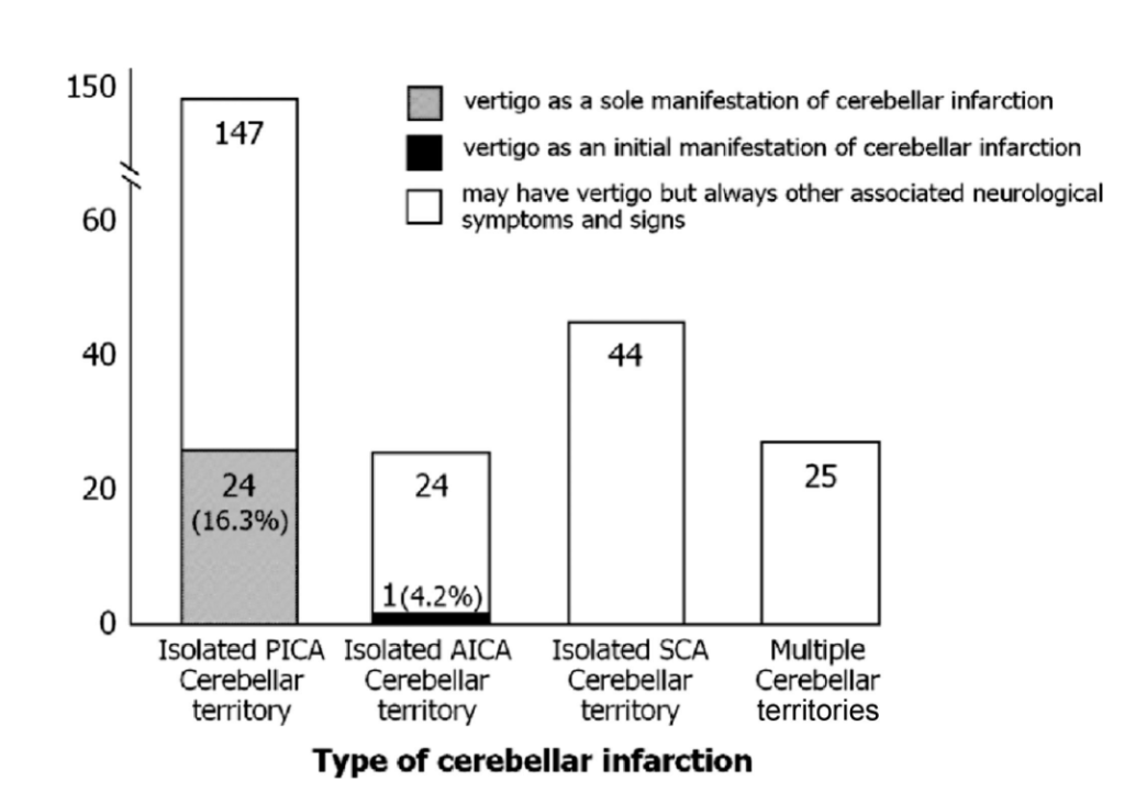 2:PICA領域の梗塞の16.3%はその他の神経症候を伴わずめまいのみで受診する