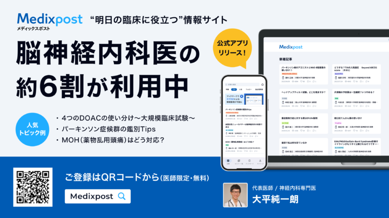 以下広告です。 日本の脳神経内科医の約6割が利用中のMedixpostをご存知ですか? Medixpostは、「明日からの臨床に役立つ」脳神経内科領域に特化した情報サイトで、全国の教授の先生から推薦いただいています! エキスパートの知識を手軽にアップデートでき、最新の重要情報もニュース感覚で手に入ります。 こちらまたは以下のバナーより数分で、無料登録いただけますので、是非ご検討ください!(医師限定 […]